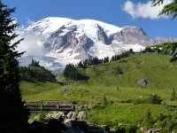 Mount Rainier is an active and massive stratovolcano in the state of Washington, 87 kilometres southeast of Seattle. It is the highest peak of the Cascade Range with 4,392 metres. Mount Rainier and the surrounding area were declared a national park which is known under the name: the Mount Rainier National Park. With 26 major glaciers Mount Rainier is the most heavily glaciated peak in the USA, if you would exclude Alaska. In the past large scaled mudflows caused devastation in the area of the volcano. The last major eruption was in 1894. A trip to the top of the mountain can only be made by people that have experience is climbing on glaciers and snowfields. The ascent takes two to three days. On clear days the mountain can be seen from as far as Portland and Seattle. Mount Rainier is considered one of the most dangerous volcanoes in the world, and it is on the so-called Decade Volcano list, which refers to the 16 volcanoes identified by the International Association of Volcanology and Chemistry of the Earth's Interior (IAVCEI) as being worthy of particular study in light of their history of large, destructive eruptions and proximity to populated areas. [1]. Because of its large amount of glacial ice, Mount Rainier could potentially produce massive lahars that would threaten the whole Puyallup River valley.